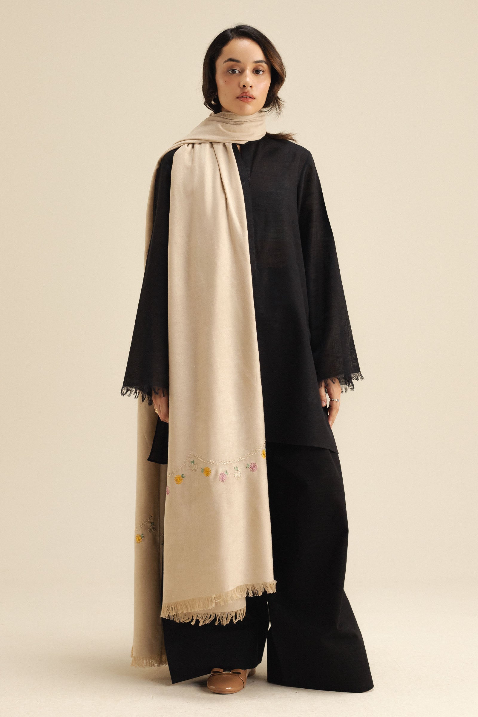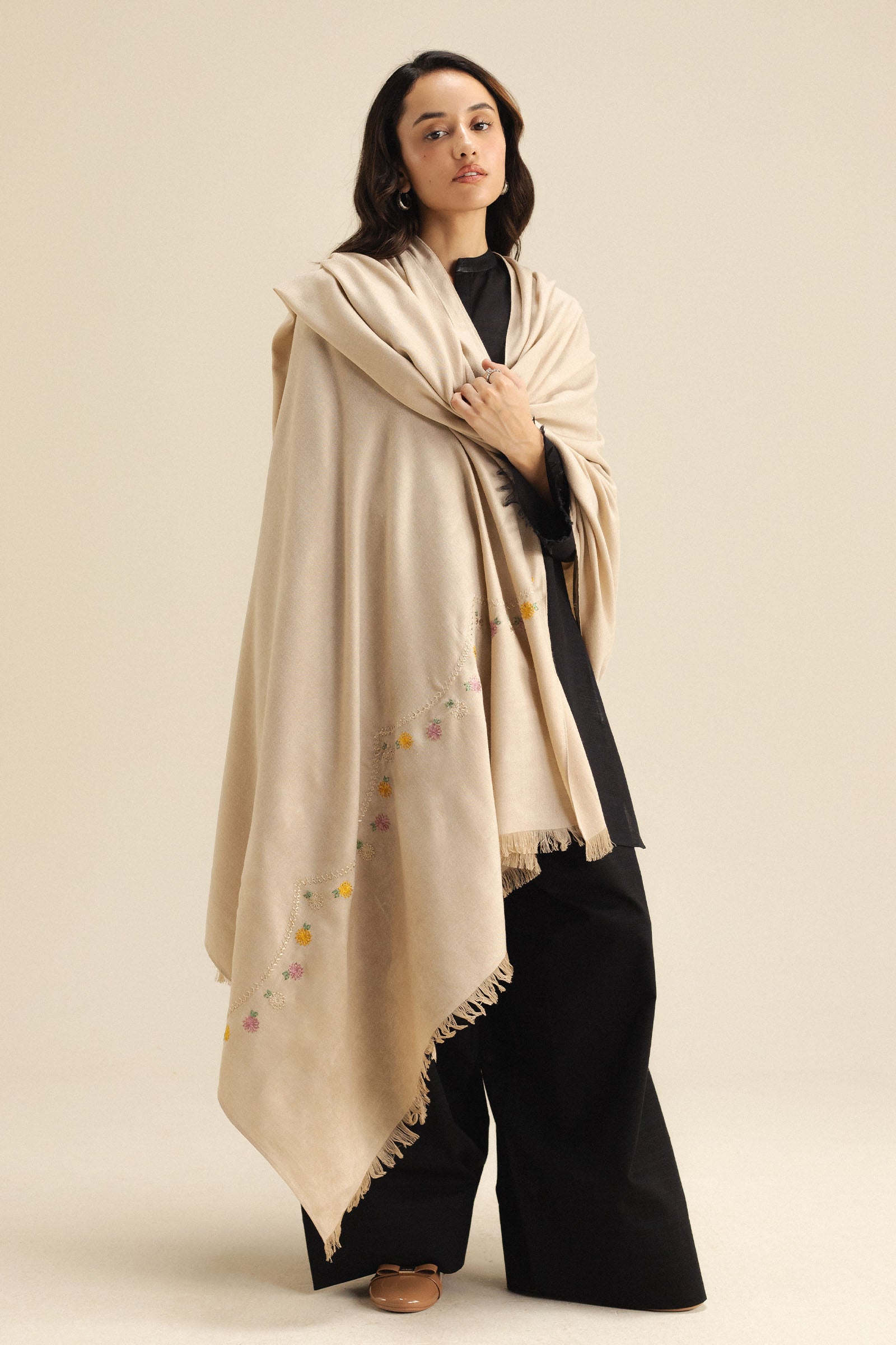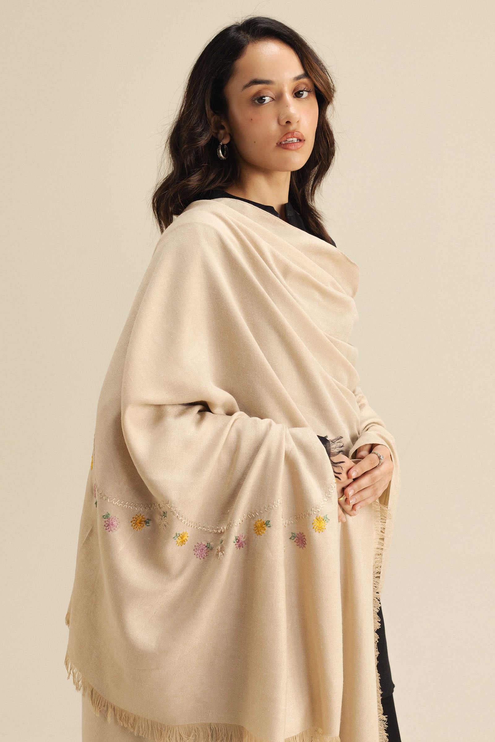 A beige wool peach shawl detailed with delicate embroidery on the pallu, ideal for adding an elegant touch to any outfit.