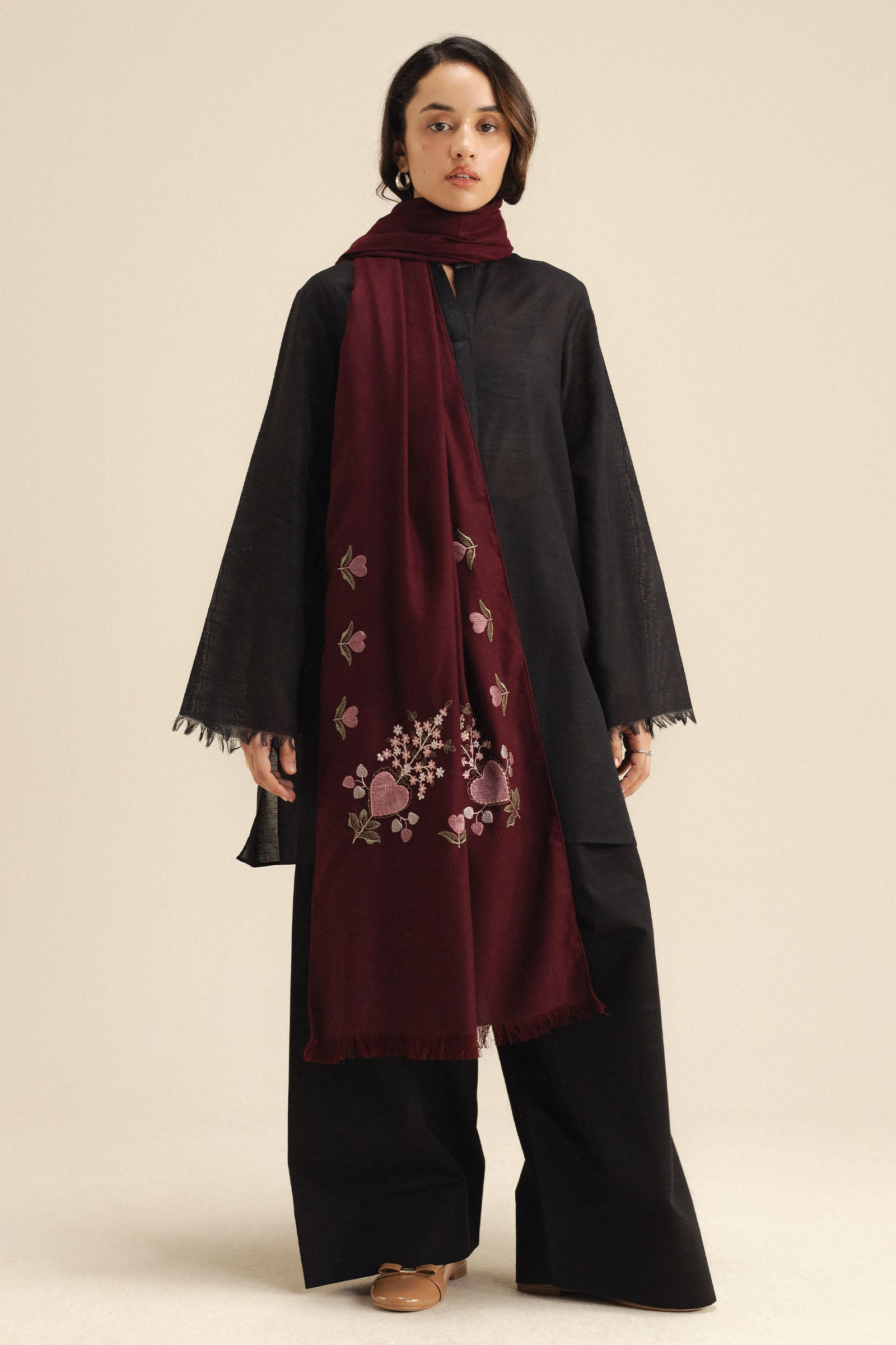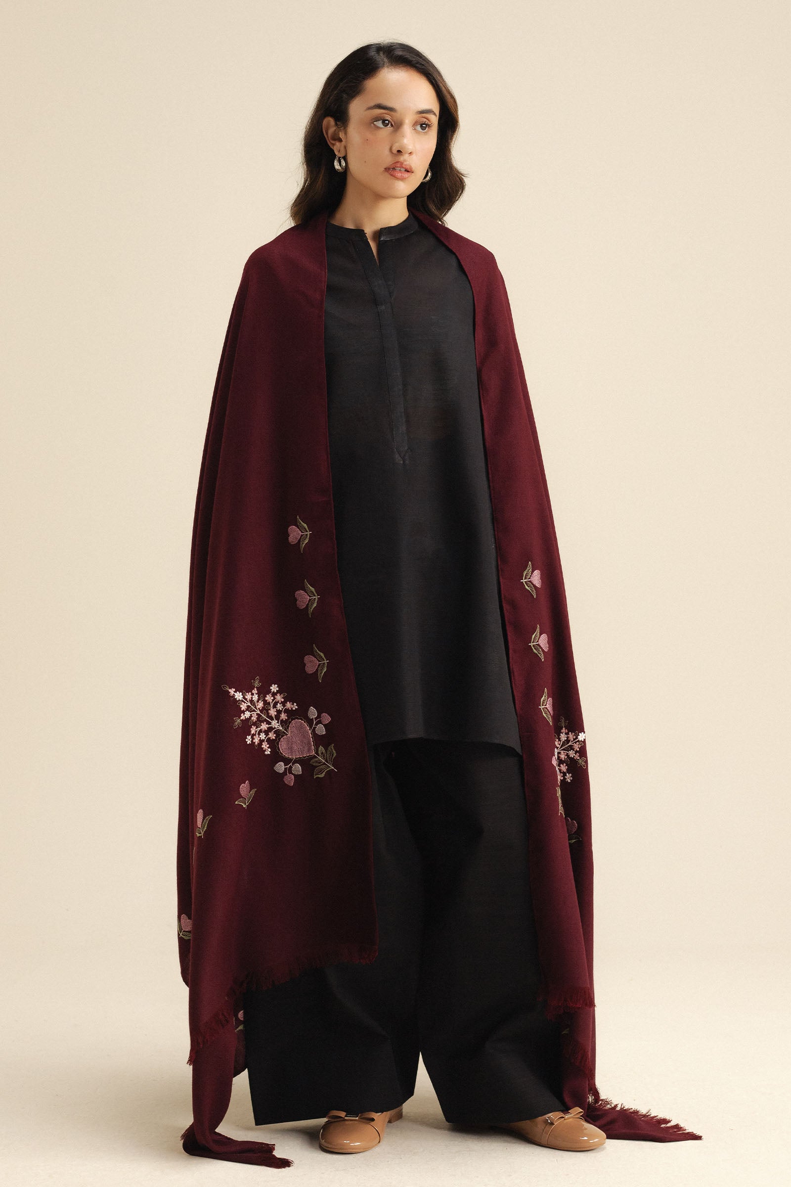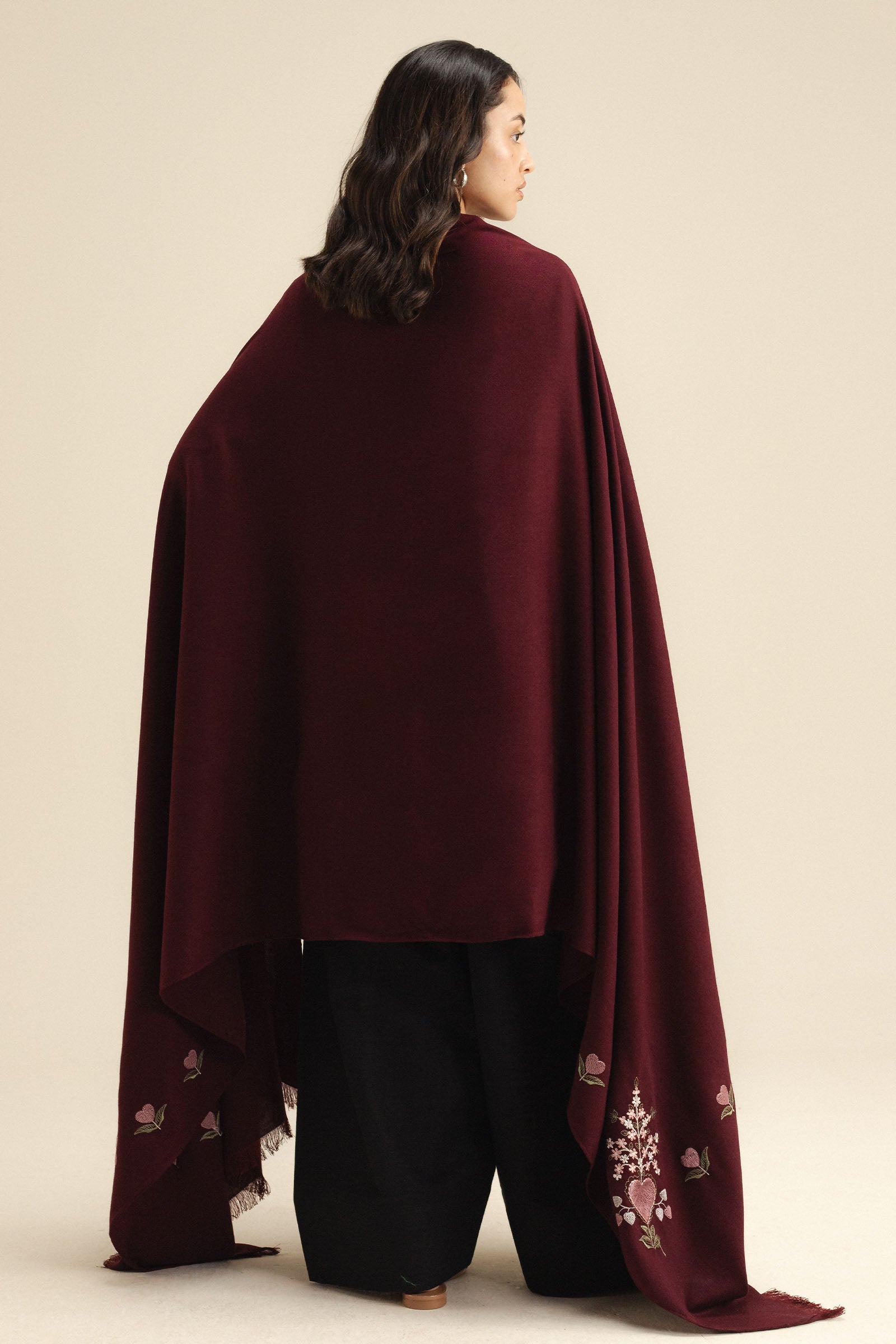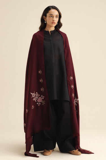A burgundy wool peach shawl featuring delicate embroidery on the pallu corners for a refined finish.