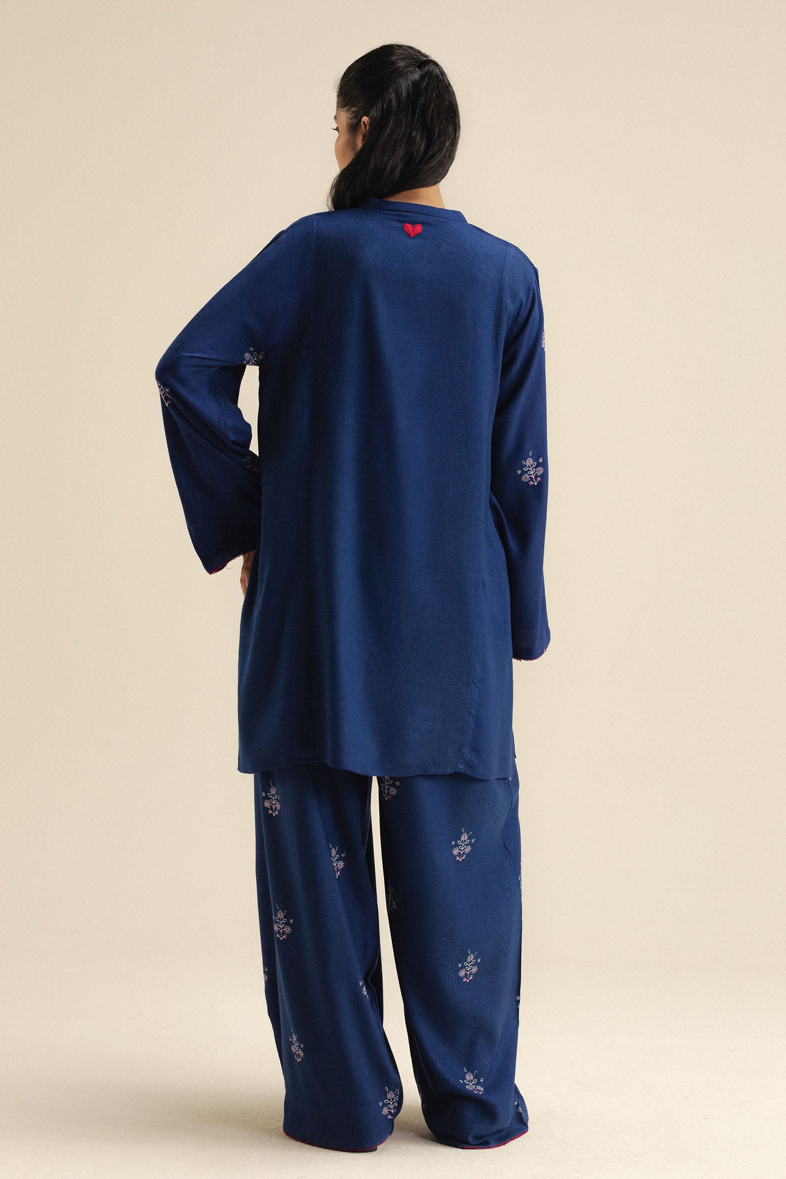 A deep blue wool peach outfit featuring delicate embroidery, paired with a farshi shalwar and finished with marganta lace detailing for an elegant finish.