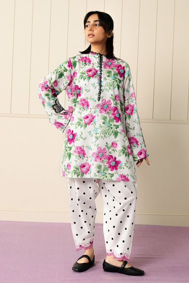 A classic floral-printed cambric kurta brought to life with delicate embroidery on the sleeves, paired with a playful polka-dot shalwar featuring subtle embroidery along the hem. Vibrant yet effortless, this look captures a joyful, contemporary spirit while staying rooted in comfort and everyday charm.