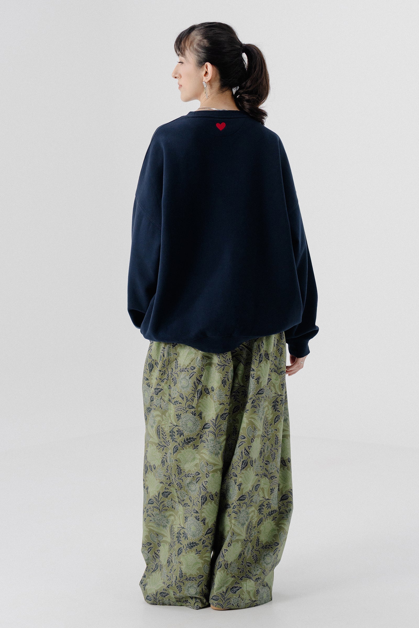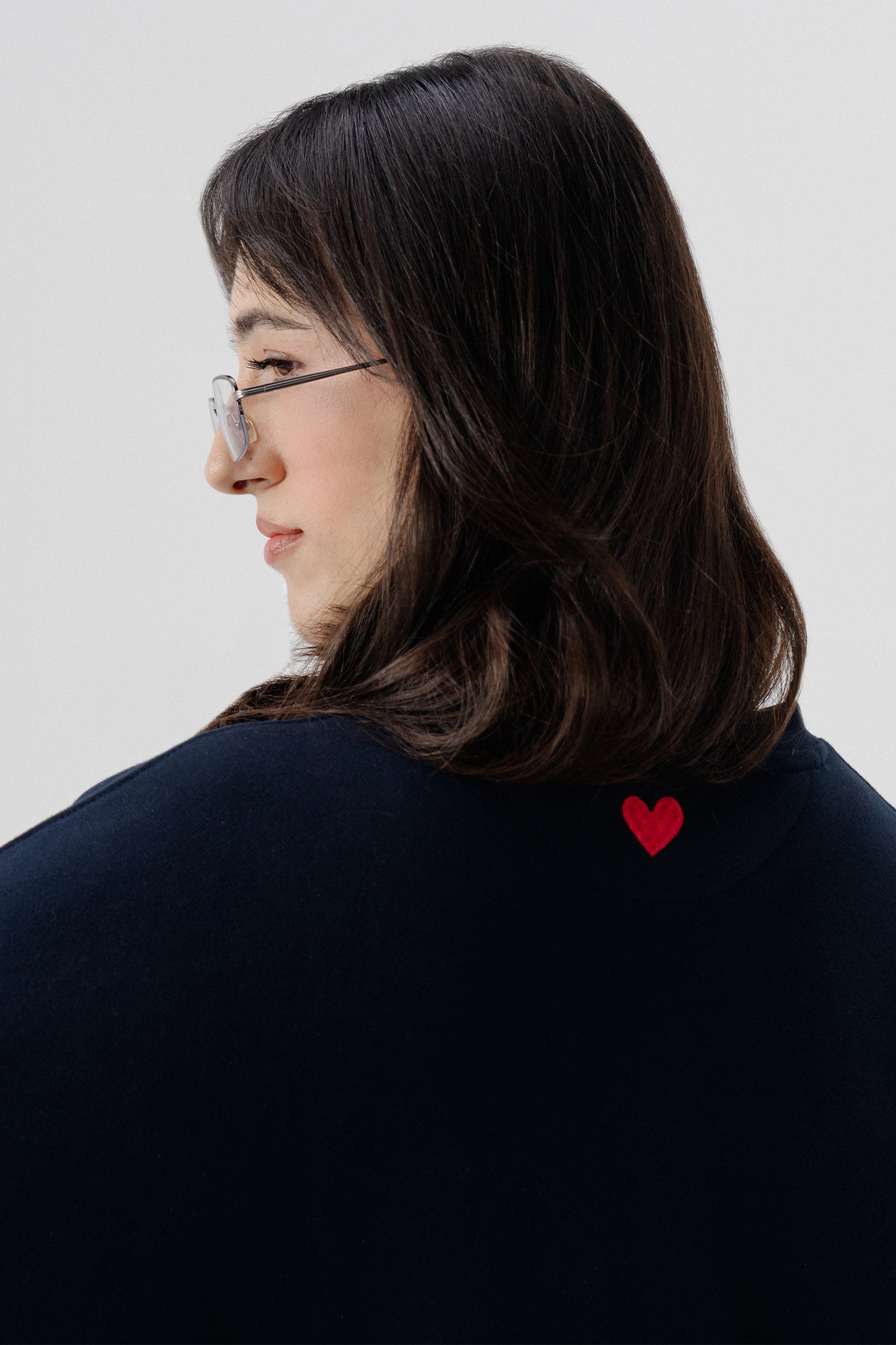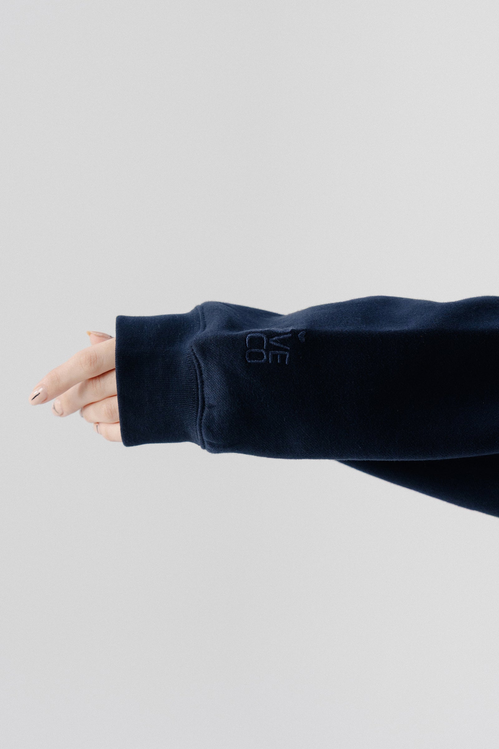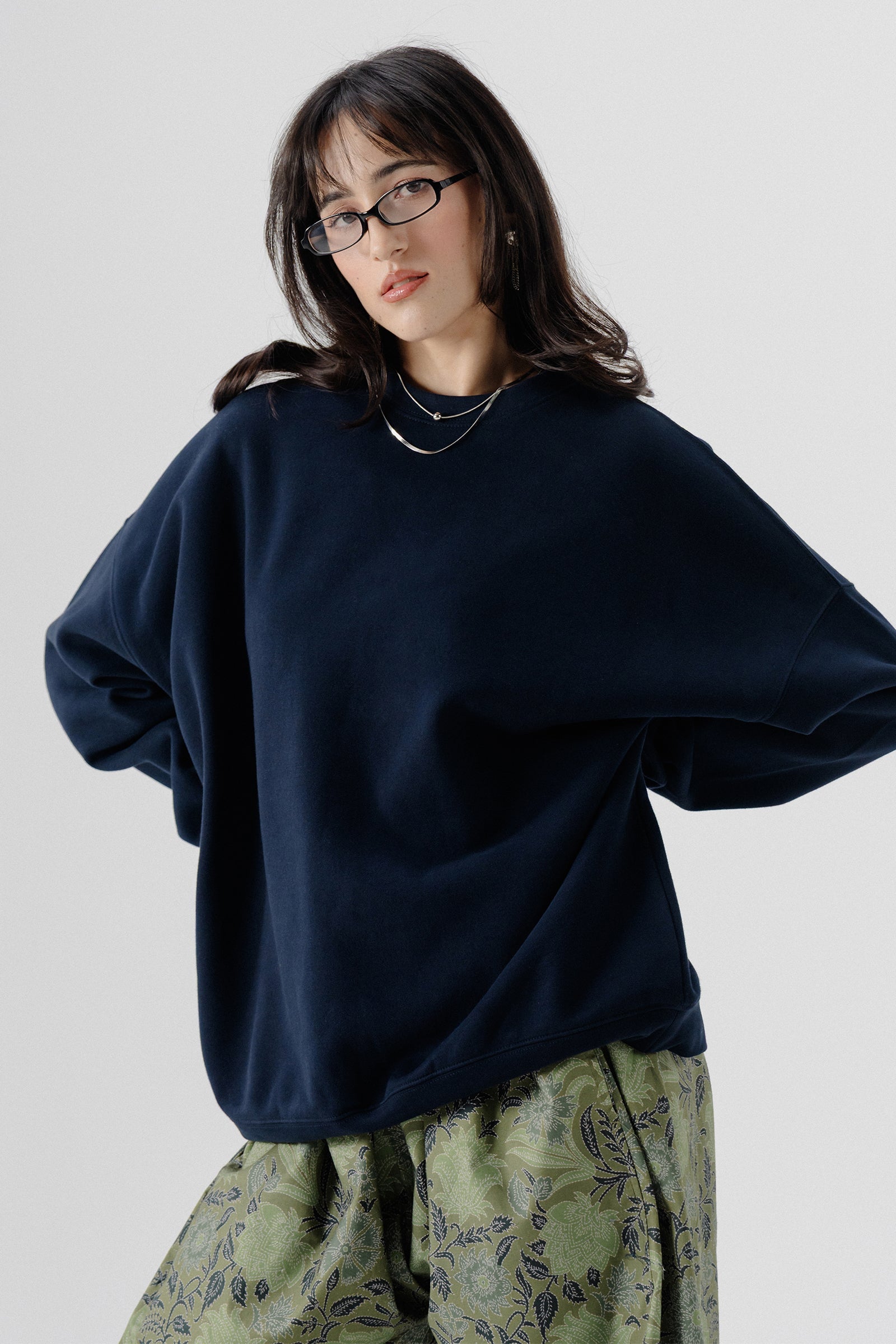 This Soft Oversized Sweatshirt is made from plush fleece peach fabric that feels smooth on the skin and keeps you comfortably warm. The rich navy hue adds a timeless, cool edge, while the detailed sleeves elevate the simple silhouette. Its relaxed, one-size fit ensures easy styling, whether layered or worn solo.