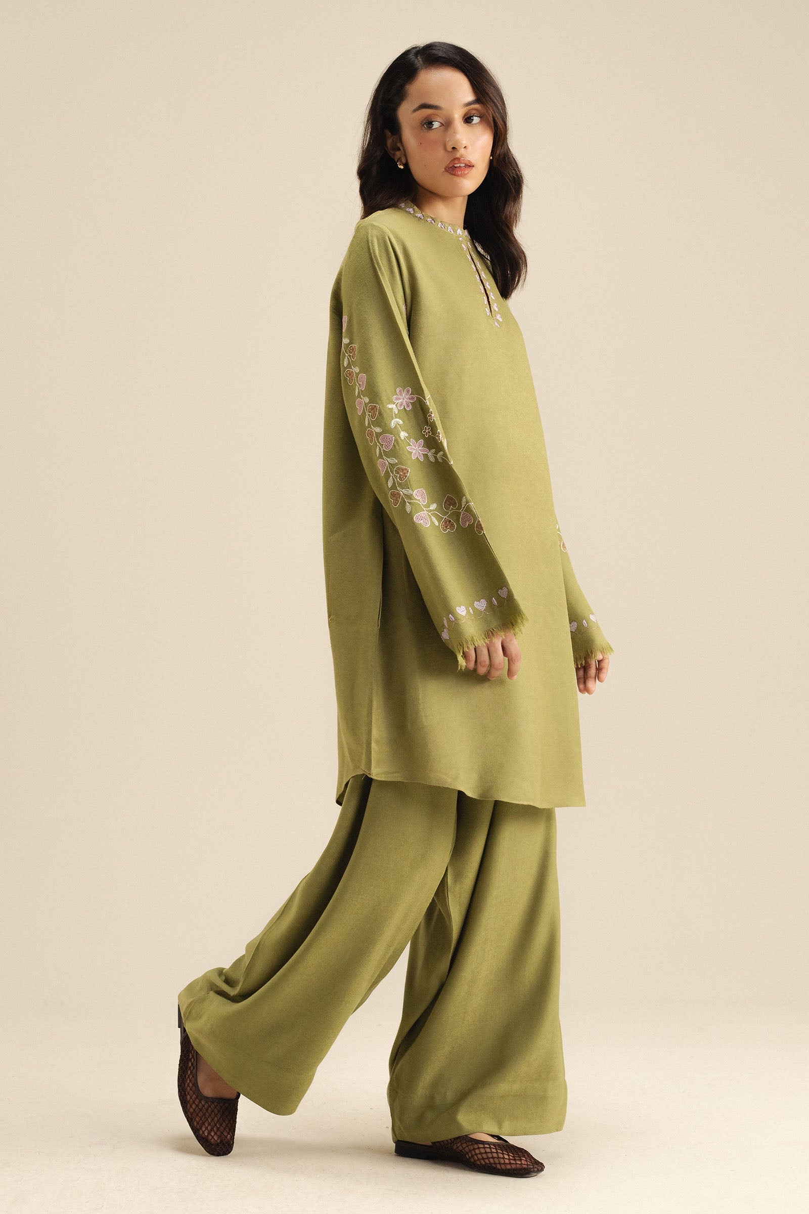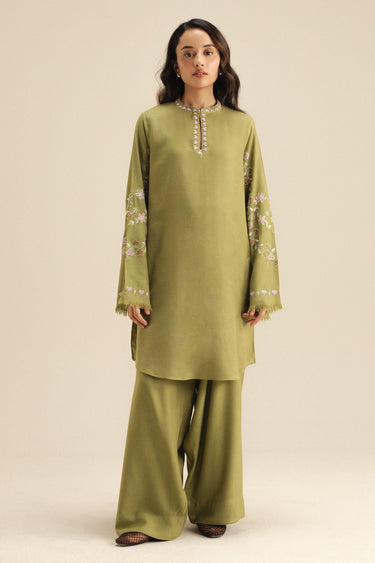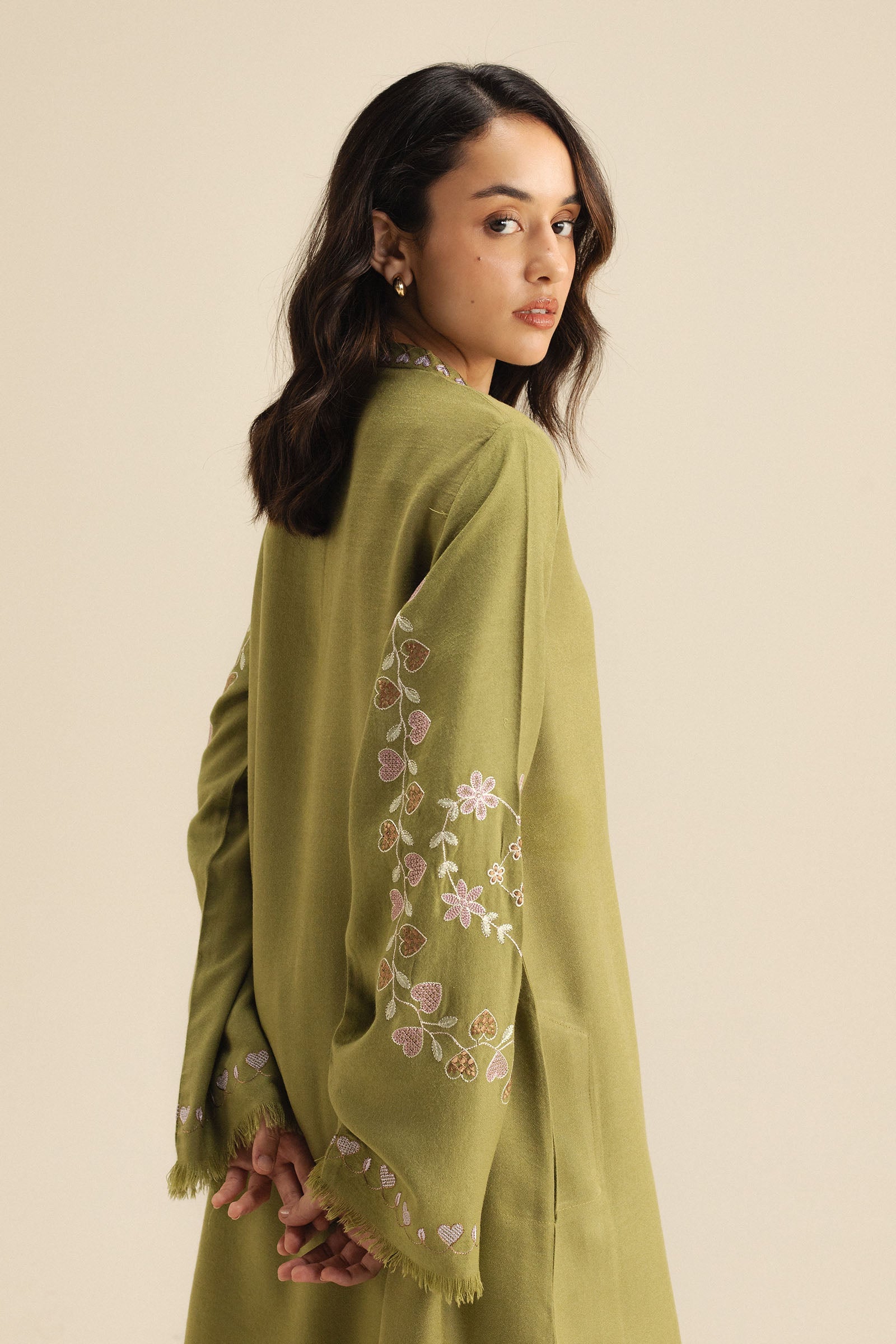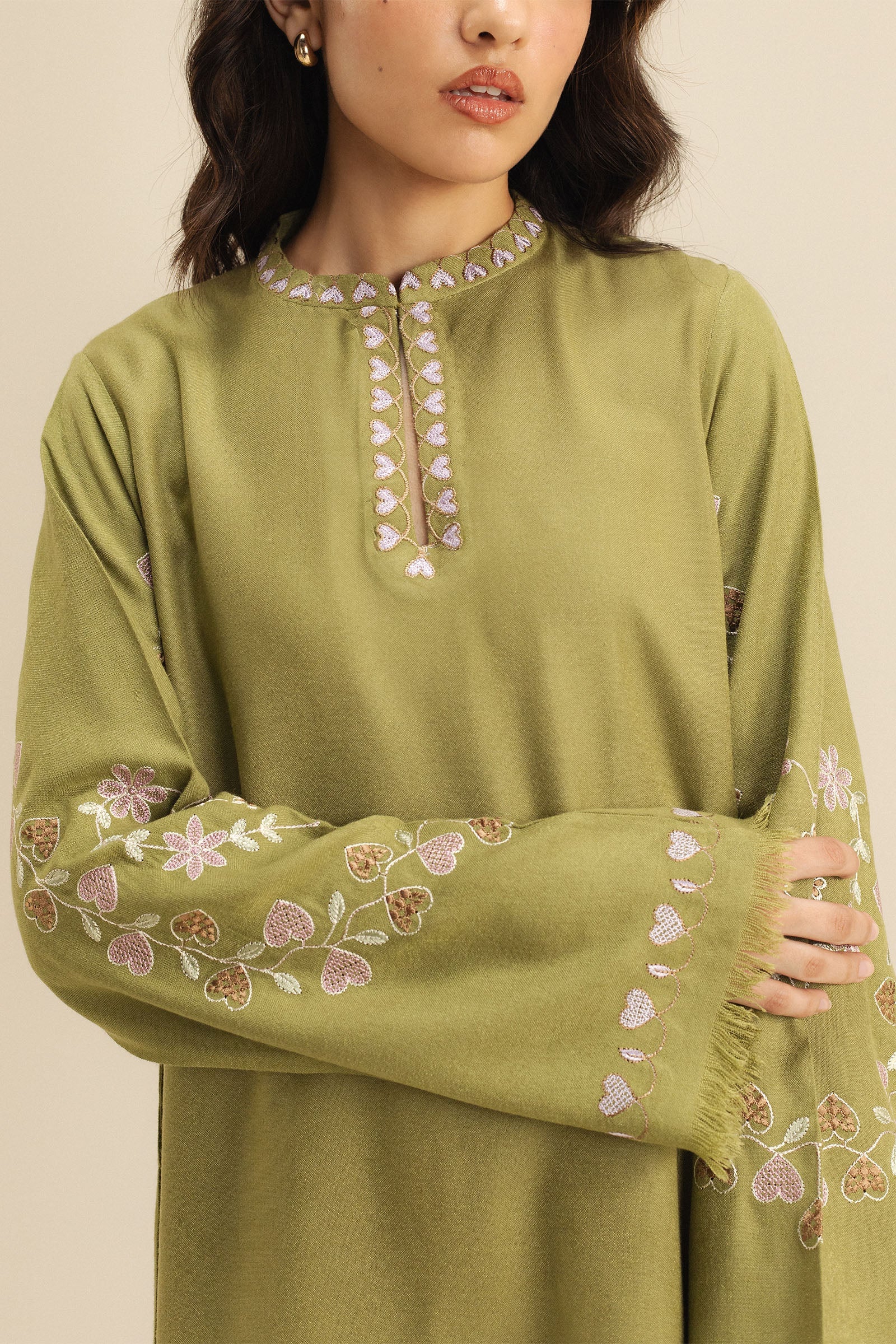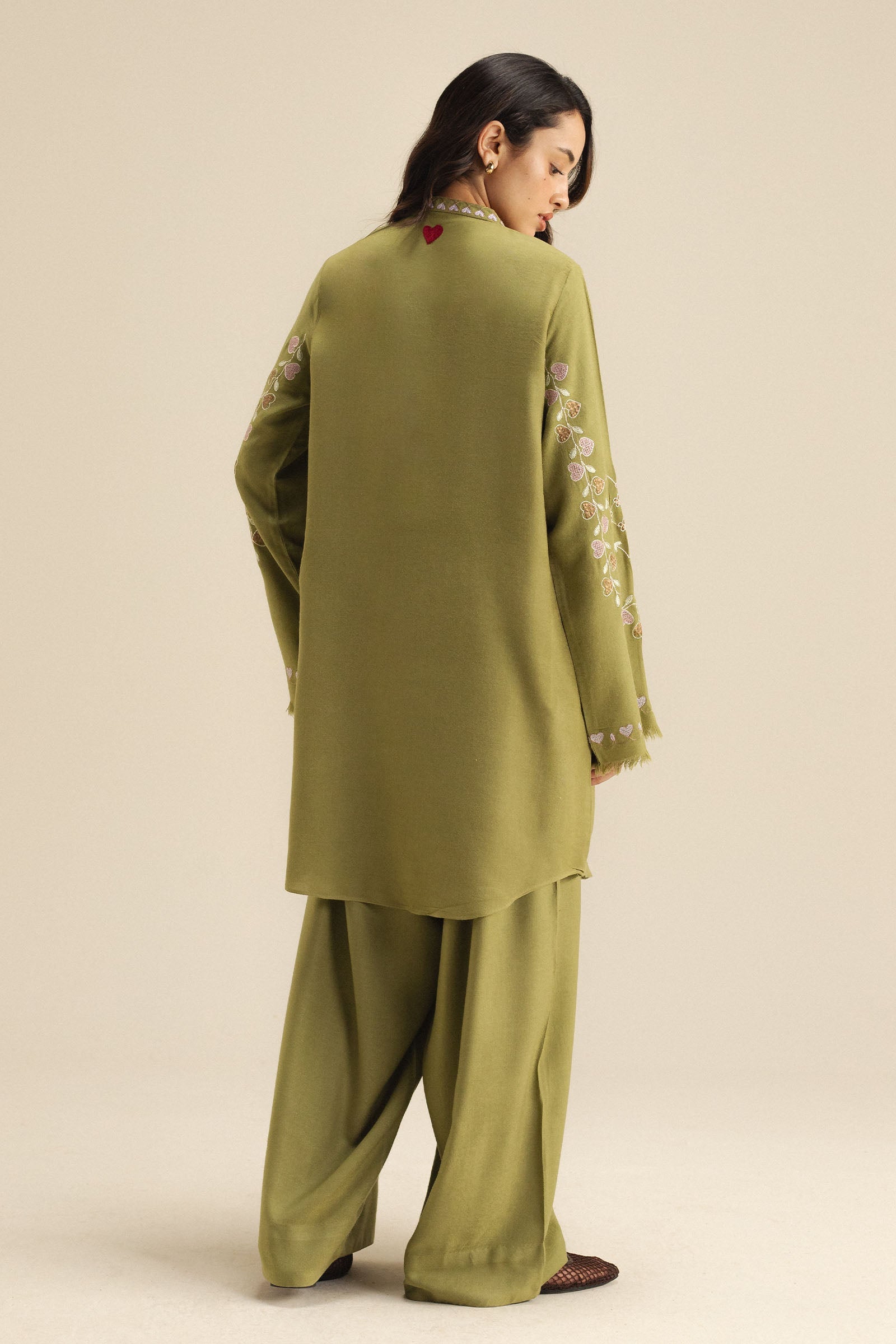 An olive green wool peach outfit featuring various embroidery elements, styled with a mid-length shirt and farshi shalwar for a playful yet polished look.
