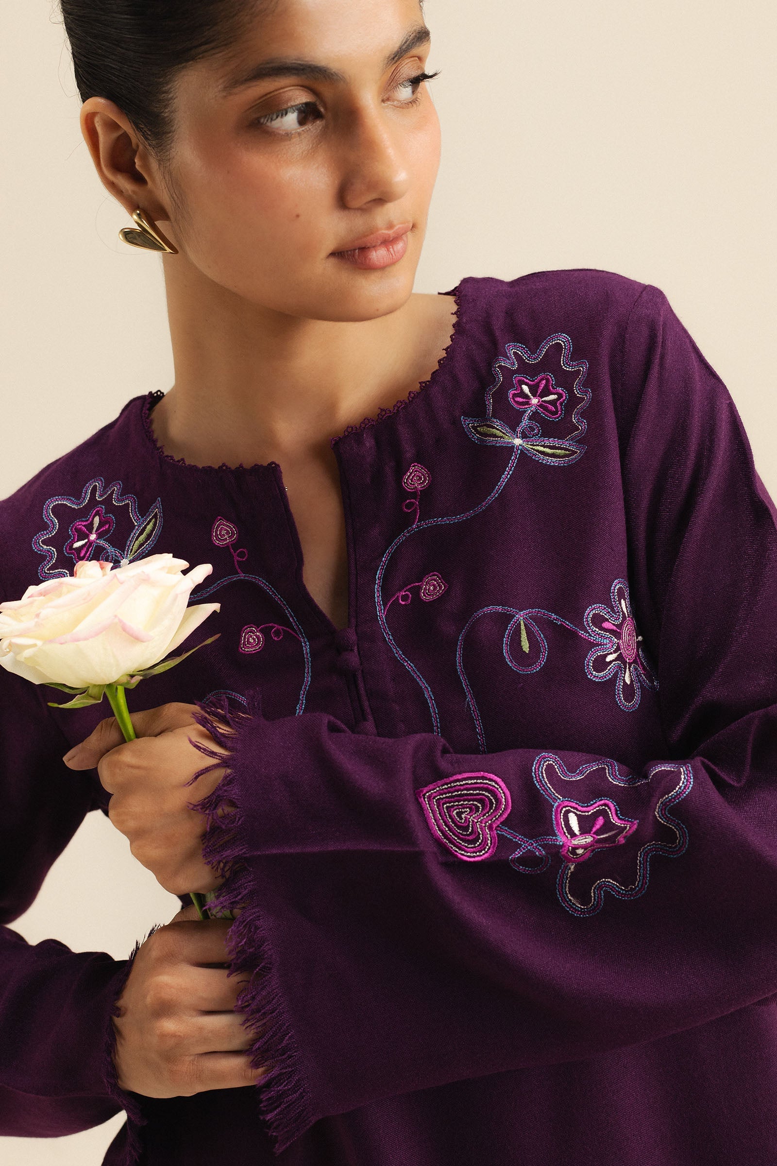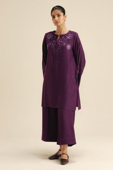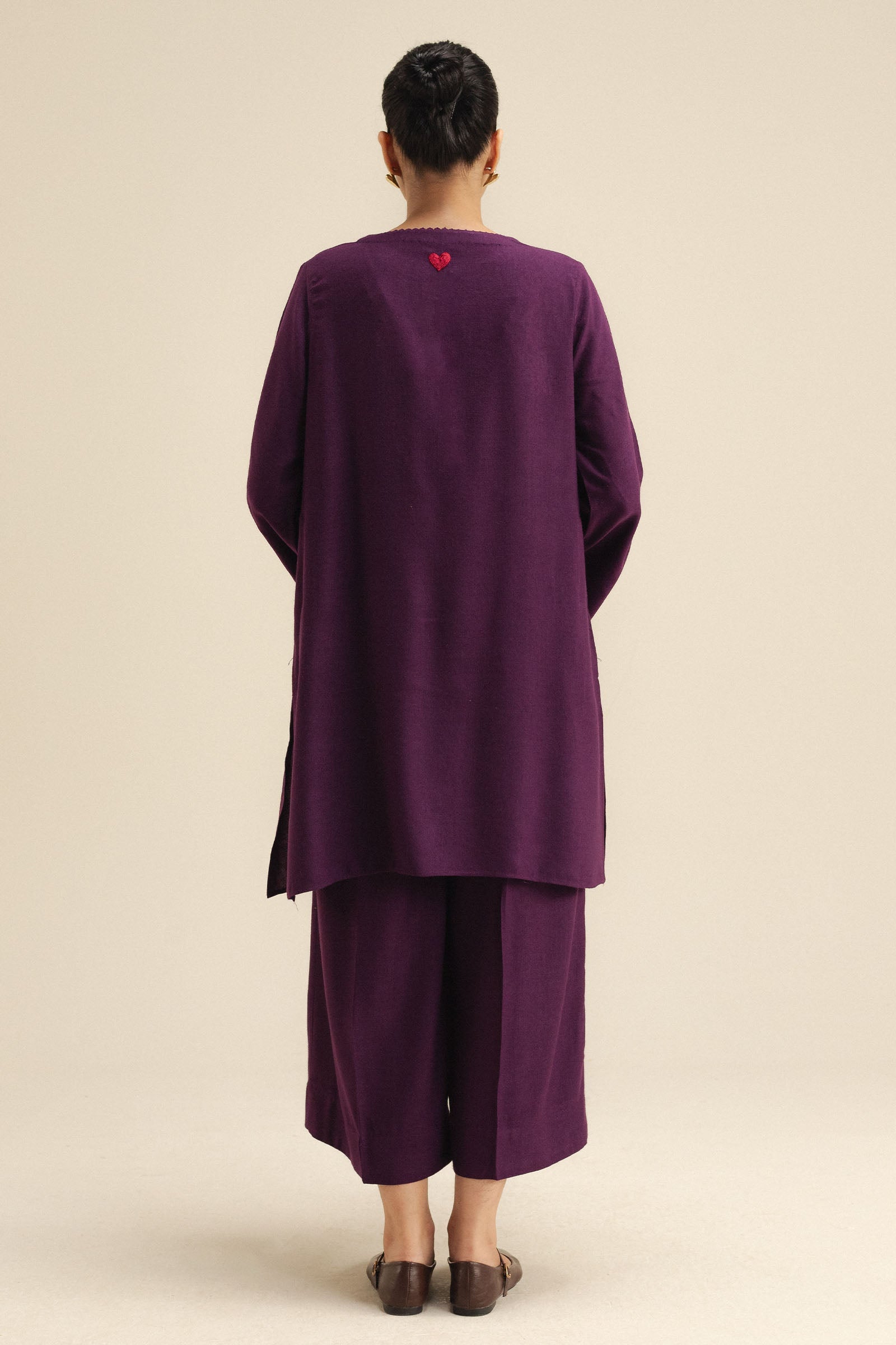 A plum wool peach outfit highlighted with playful embroidery in accent hues on the neckline and sleeves, paired with culottes for a chic finish.