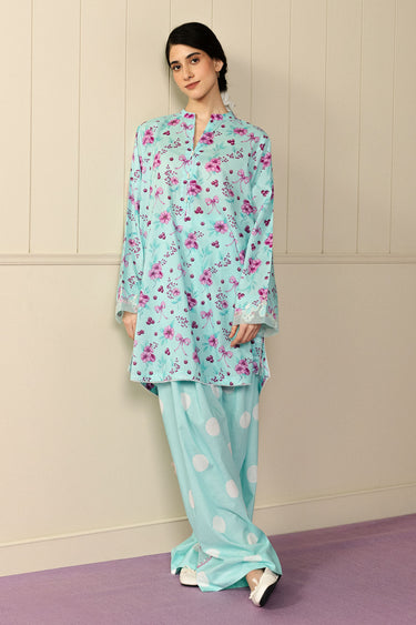A loose-fit cambric kurta with a softly rounded hem and delicate sleeve embroidery, paired with a playful polka-dot farshi shalwar. Light, breathable, and effortlessly charming; style with minimal jewelry and flats for daytime ease or elevate with statement earrings for relaxed evenings.